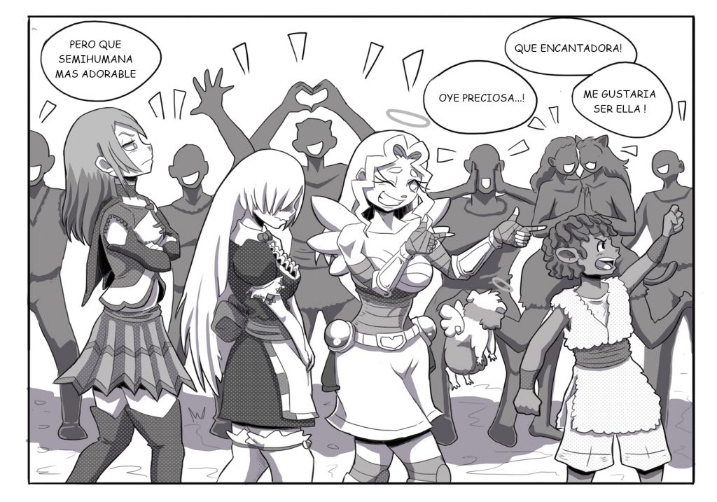 Había pasado una hora y el grupo finalmente llegó al pueblo, aquel niño dijo la verdad. Escondida tras un bosque húmedo, estaba aquella aldea que tenía repartida muchas casas al estilo colonial. Había habitantes humanos y semihumanos que vivían en completa armonía en ese lugar. Los niños corrían y jugaban sin cesar, sus padres se mostraban felices al hacer sus arduos quehaceres. Los solteros chicos al notar a Lyna y Celeste, sucumbieron ante su belleza y fueron los primeros en recibirlas.
