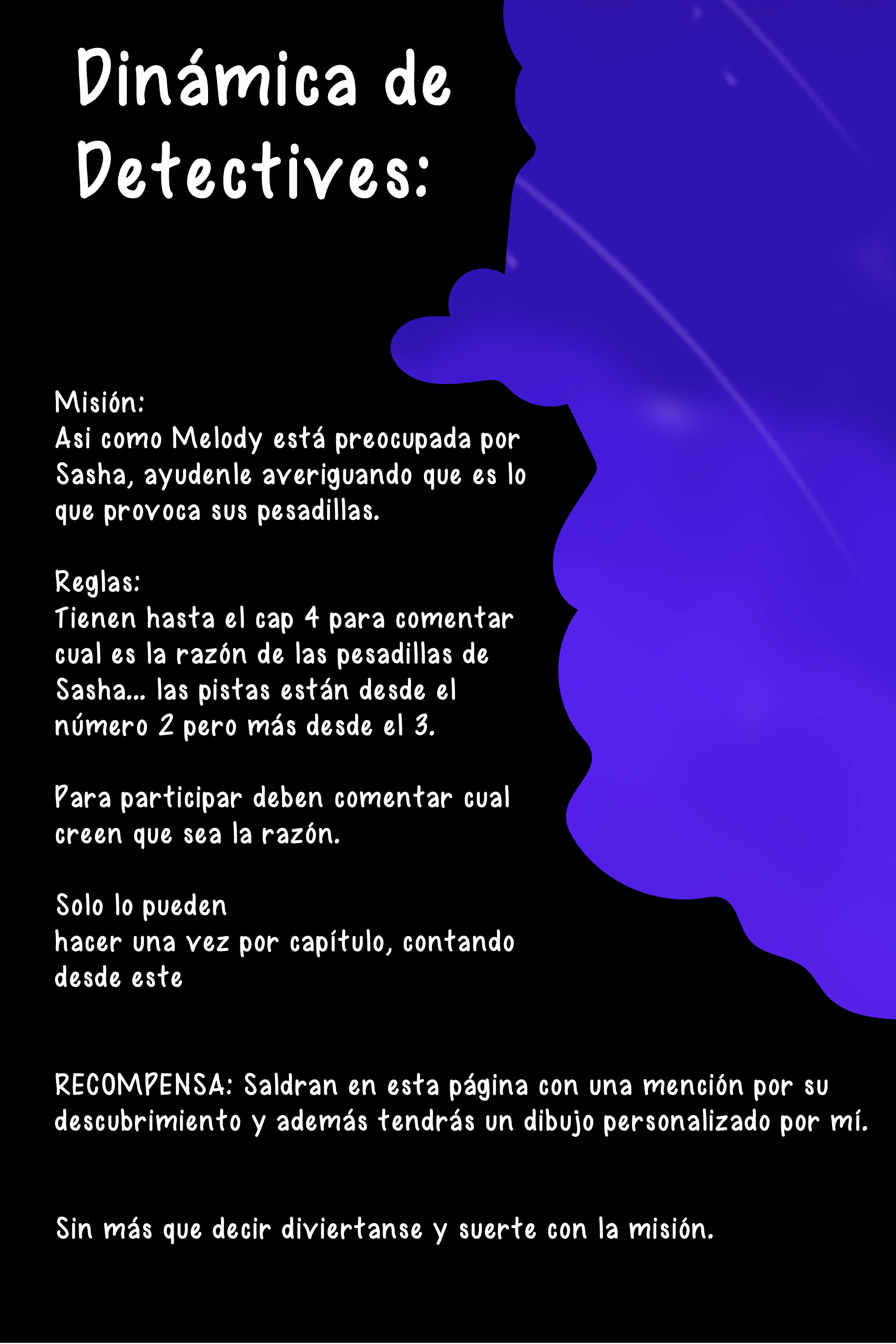 asuuu que buenaaaaa teoría, felicidades, en el cap 4 habrán mas pistas y tendrás una oportunidad para lanzar otra teoría
