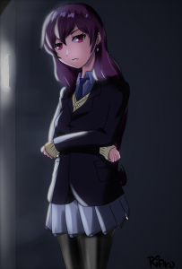 Me propongo entonces abrir los ojos completamente, y al hacerlo me percato que la voz proviene de una figura parada frente a mí. De a poco esta figura toma forma y me muestra a una chica de cabello largo y negro con tonos violetas, unos ojos negros y alargados muestran una mirada penetrante e intimidadora. Su piel es clara y tiene un uniforme compuesto de una chaqueta negra, un chaleco color crema, camisa blanca, falda blanca, unas pantimedias negras y zapatos escolares ídem, en conjunto con su figura de modelo es alguien que llama la atención, además su corbata azul me da a entender que es una chica de un grado superior y por alguna extraña razón me parece conocida.