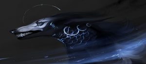 Era una bestia parecida a un lobo gigante de un color oscuro fuerte, que tenía escamas y un aura azul.