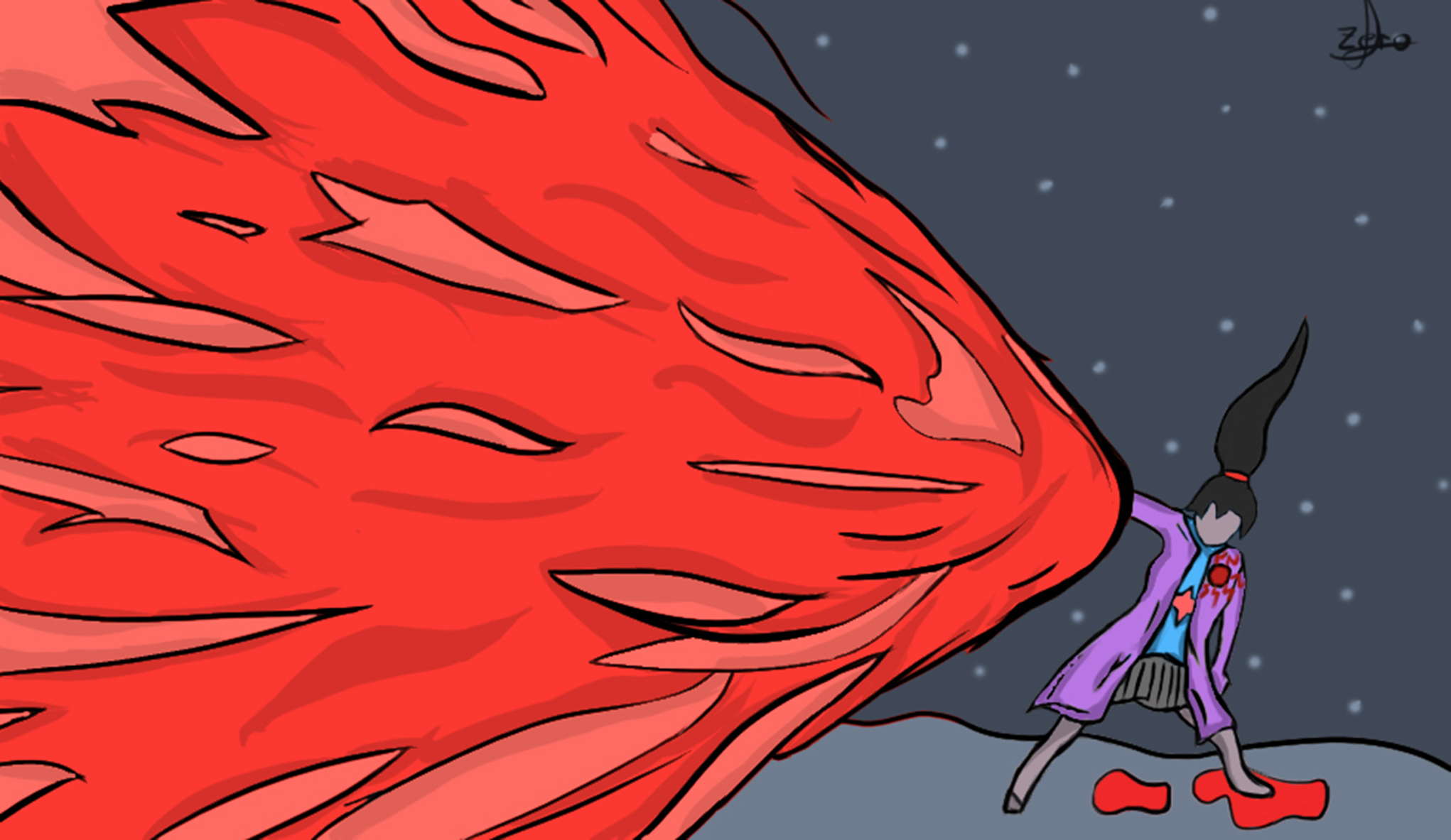 Entre rugidos frenéticos, e impactos de ensueño. Rojo y negro buscaban superar sus respectivos límites. Una estrella crecía en el punto cero, donde dragón y lanza pujaban en celo. Anulando vectores de fuerza opuestos que rasgaban el plano virtual…