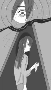 Observó que la venda estaba en el suelo, así que se agachó para recogerla, tétricamente volteó su cabeza para intentar verlos, su largo cabello cubría gran parte de su cara solo dejando ver su ojo derecho.