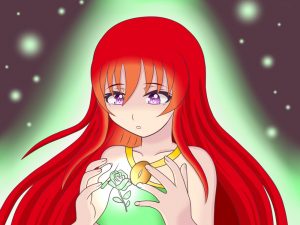 Reina libera su aura, que es de un hermoso color verde. Coloca sus manos frente a su pecho y concentra energía, entonces comienza a aparecer un trozo de cristal que poco a poco va tomando forma…