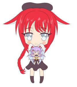 Una niña de cabello rojo, atado con una trenza larga, de baja estatura y orejas de…
