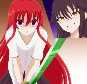 La joven pelirroja alza su espada, mientras que Sadokawa solo porta un cuchillo bastante grande.