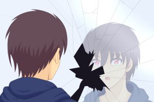 La pequeña se sorprende y luego muestra algo de tristeza. Entonces Zero mira un pequeño charco y nota su reflejo, nota sus ojos rojos…