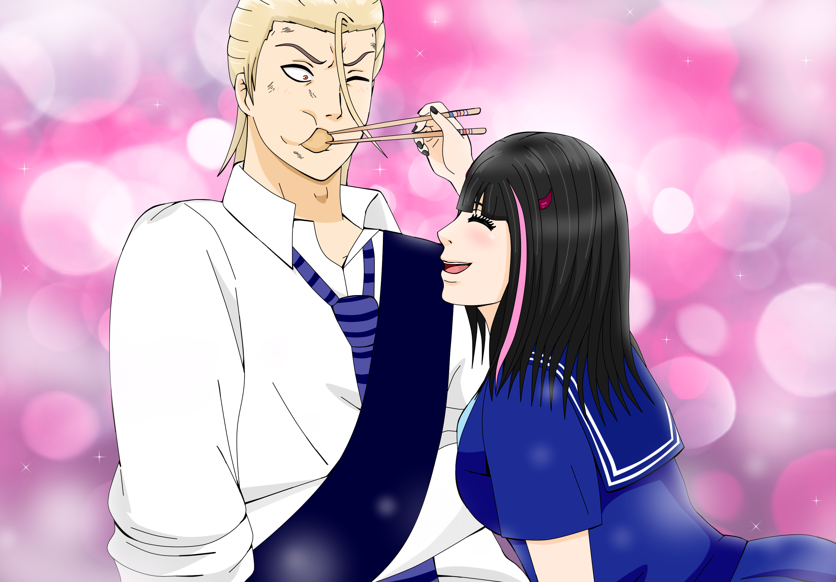 El rubio tomó los palillos con su mano menos diestra. Tembloroso, trató de comer el primer bocado, pero su torpeza lo hizo soltarlos. Maldijo y probó otra vez. El resto de sus acompañantes lo observó inseguras de sí ayudarlo. Las enamoradas como Rina y Anzu desearon animarse a darle de comer, sin embargo apartaron ese deseo de sus cabezas por distintas razones, ya sea por orgullo o por timidez. Saki descubrió a las nerviosas chicas, como fiel aliada intervino para que tuvieran la oportunidad de acercarse a Kimura.
