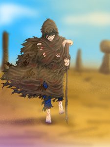 Mostrando sus respetos a aquel viejito, se inclinó levemente y acerco para tomar la comida, le pidió a la niña que buscara algo para guardarla, al menos para el resto del día, con eso dicho y luego de un rato ya hecho, ambos decidieron emprender su viaje, la niña se quedó pensativa por abandonar aquel lugar que era hogar, pero debía avanzar, antes de irse esta fue a su casita y trajo lo poco de comida que había ahí y la trajo consigo en una pequeña ollita para cocinarla después. Más allá de las pequeñas chozitas, no eran capaces de ver nada, todo afuera era solo un completo desierto, el viento soplaba con fuerza, movía la arena con fuerza cada vez que soplaba, era una tormenta constante que no dejaba de soplar, y en ese momento, con ambos afuera de ese asentamiento del desierto, comenzaron su camino a través de aquel desierto que no parecía tener fin, volteando a ver por última vez ese asentamiento, se despidieron con una gran tristeza en sus rostros, sabían, que ya nunca más podrían volver.